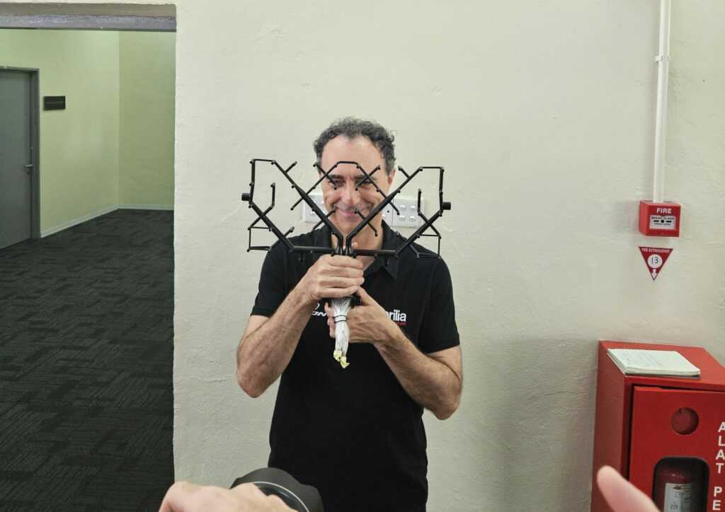 Pour Romano Albesiano, directeur technique d’Aprilia, il s’agissait de confirmer certains calculs. « Les logiciels prédisent donc le flux autour du pilote ou la forme de la moto, confie l’Italien. Mais comme pour tout calcul, vous devez le confirmer par une expérimentation. Voici l’une des expériences possibles pour confirmer que l’ordinateur dit la vérité. Vous établissez donc la carte de la pression à l’arrière et vous la comparez avec ce que l’ordinateur, qui est une soufflerie virtuelle, a réalisé dans la vraie soufflerie. »