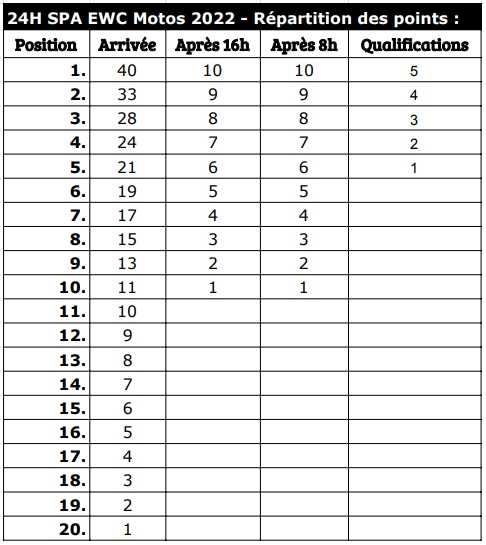 Le plus gros sera évidemment à marquer au passage du drapeau à damiers, sorti à partir de 13h le dimanche. L’équipe qui s’imposera en empochera 40, contre 33 et 28 pour les deux qui monteront à ses côtés sur le podium. Les vingt premiers teams arrivés seront récompensés, selon la répartition détaillée ci-dessous :