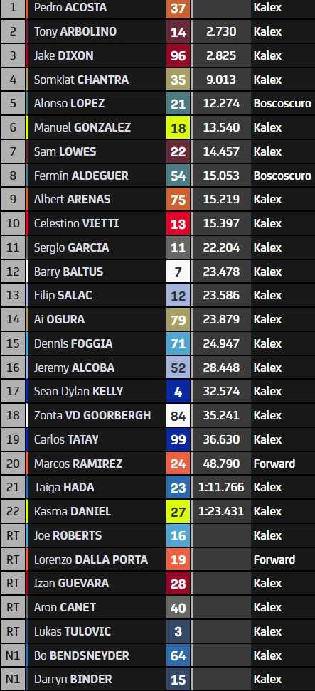 Championnat Moto2 actuel : 1. Tony Arbolino 139 pts, 2. Pedro Acosta 124 (-15), 3. Alonso Lopez 82 (-57), 4. Jake Dixon 79 (-60), 5. Filip Salac 72 (-67)…