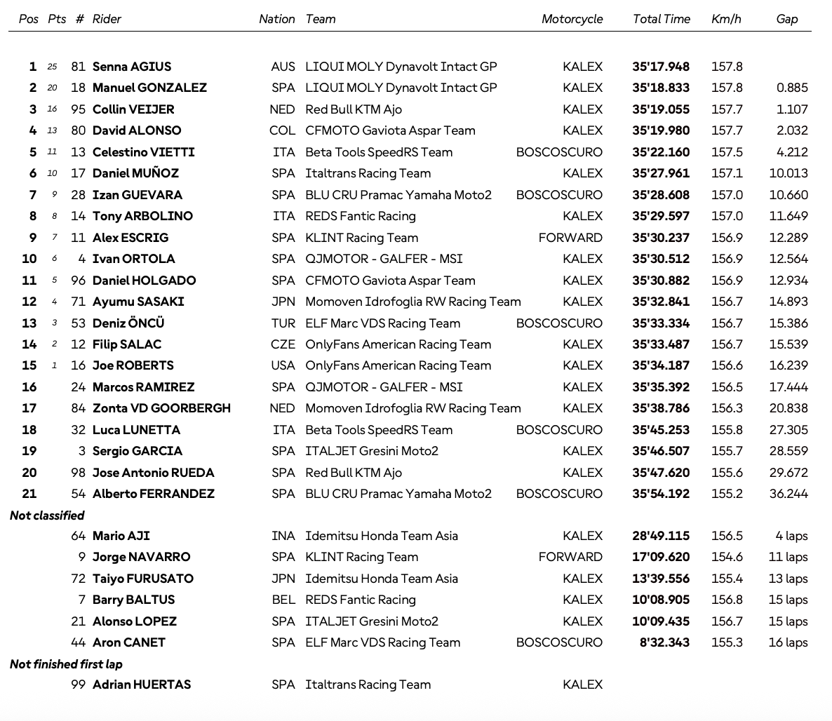Collin Veijer, parti en pole position pour la première fois de sa carrière en Moto2, monte sur la dernière marche du podium. David Alonso arrache la quatrième place après une folle remontée.