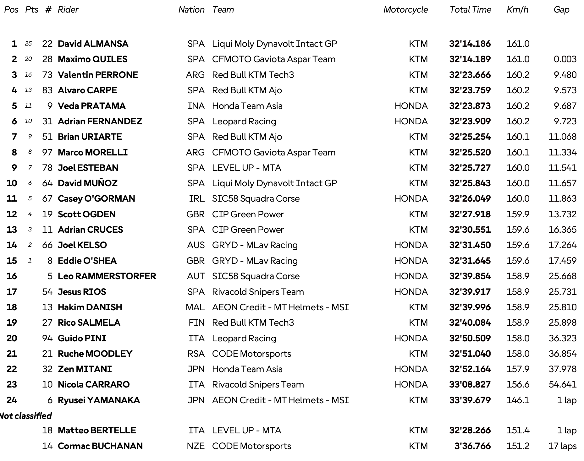 Sous le drapeau à damier, Almansa arrache la première place avec une avance infime de 3 millièmes de seconde sur Quiles. Ce finish rentre dans les annales puisqu'il égale le plus serré jamais enregistré dans l'histoire du Moto3, un record intouchable depuis le Grand Prix d'Australie en 2013.
