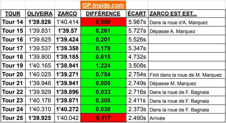 Les données du Grand Prix montrent que le pilote Ducati est capable de revenir sur la KTM, car il lui a repris 615 millièmes au tour 18, 1224 millièmes (1,2 seconde) au tour 19 et 754 millièmes au tour 20, avant de se retrouver derrière Marc Marquez et Francesco Bagnaia. Cela semble d’autant plus possible après-coup que Miguel Oliveira a du mal dans les tours 23 (1’40.176) et 24 (1’40.310), alors que Johann Zarco est capable de faire une seconde de mieux, comme il l’a prouvé quelques minutes plus tôt.