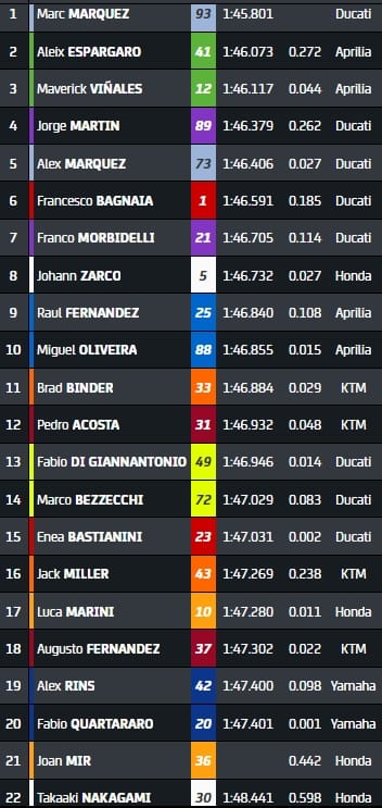 Aragon - Essais MotoGP (top-10 directement en Q2) :