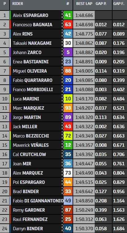 Le leader de la matinée devance de seulement 12 millièmes l’homme en forme du moment, Francesco Bagnaia, vainqueur des quatre dernières courses en date. Monté sur la plus haute marche du podium en Aragon en 2020, Alex Rins complète le top-3 devant Takaaki Nakagami, poleman ici deux ans plus tôt. Aprilia, Ducati, Suzuki, Honda : la FP1 se conclut avec quatre constructeurs aux quatre premières places.