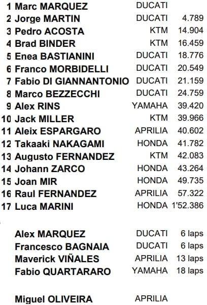 Championnat MotoGP : 1. Jorge Martin 299 pts, 2. Francesco Bagnaia 276, 3. Marc Marquez 229 (-70), 4. Enea Bastianini 228 (-71), 5. Pedro Acosta 148 (-151)... Classement complet en cliquant ici
