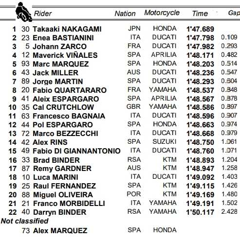 Souvent rapide le dimanche matin, Takaaki Nakagami a signé le meilleur temps du warm-up du Grand Prix d’Aragon, devant Enea Bastianini et Johann Zarco. Les températures plus fraîches qu’au moment du départ, à 14h, ont limité le travail de préparation qui pouvait être effectué.