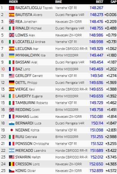 Meilleur pilote Honda, Iker Lecuona termine aussi meilleur rookie au septième rang, pour la première Superpole de sa carrière. Il devance Ilya Mykhalchyk, remplaçant du blessé Michael van der Mark chez BMW. La marque allemande aura un second représentant dans le top-10 sur la grille : le Français Loris Baz, tout juste dixième à 1,2 seconde du meilleur temps.