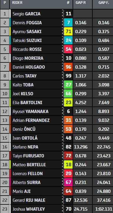 Championnat Moto3 après le GP d’Argentine (3/21) : 1. Sergio Garcia 58 pts, 2. Dennis Foggia 54 (-4), 3. Izan Guevara 28 (-30)…