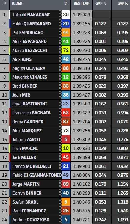 Impressionnant meilleur rookie sur sa GP21, Marco Bezzecchi (5e) complète le top-5 et fait office de meilleur pilote Ducati. Il est même le seul représentant de la marque italienne dans le top-10 provisoirement qualificatif pour la Q2 : tous les autres, d’Enea Bastianini (11e) à Jorge Martin (20e) en passant par Francesco Bagnaia (12e), Johann Zarco (15e), Luca Marini (16e), Jack Miller (17e) et Fabio di Giannantonio (19e), sont menacés par un passage par la séance de repêchage. Il leur faudra gagner des places en FP2 pour s’éviter cet exercice.