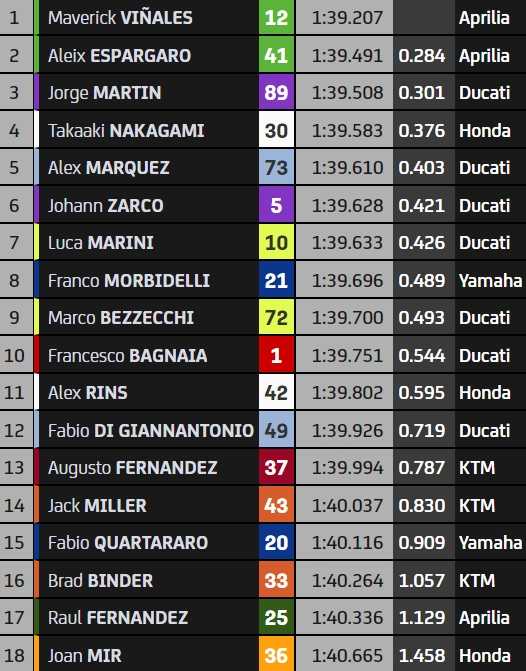 Le champion du monde MotoGP 2021 est en effet parmi les pilotes provisoirement recalés de la Q2, en compagnie d’Alex Rins qui est tombé (11ème), des KTM officielles de Jack Miller (14ème) et Brad Binder (16ème), ou encore de Joan Mir bon dernier sur sa Honda Repsol (18ème). La dix-huitième correspond à la dernière position en raison des absences d’Enea Bastianini, Marc Marquez, Miguel Oliveira et Pol Espargaro, tous blessés.
