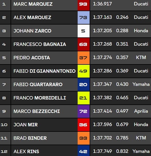 - Johann Zarco (3e) hisse Honda en première ligne et fait office de premier pilote non-Ducati, refusant la première rangée à Francesco Bagnaia (4e). Pedro Acosta (5e) permet aussi à KTM de figurer dans le haut du classement, sur une deuxième ligne complétée par Fabio di Giannantonio (6e).