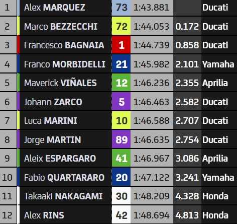 Ducati, justement, a verrouillé la première ligne avec Marco Bezzecchi (2ème) et Francesco Bagnaia (3ème) aux côtés d’Alex Marquez. Les deux italiens ont eux aussi fait le choix de terminer la séance en pneus slicks, de même que Luca Marini qui s’est lui manqué (7ème). Meilleur pilote parmi ceux restés en pneus pluie, Franco Morbidelli (4ème) ouvrira la deuxième file, pour sa meilleure qualification depuis le Grand Prix de France 2021. Il aura derrière lui Maverick Vinales (5ème) et Johann Zarco (6ème), à qui il a manqué un peu d’aisance dans des conditions qu’il apprécie pourtant.