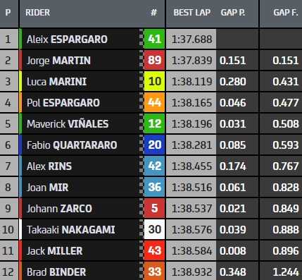 Habitué aux premières lignes, Jorge Martin (2e) signe sa quatrième consécutive depuis Valence 2021. Meilleur Ducatiste du jour, il devance un heureux Luca Marini (3e), qui offre à l’équipe VR46 sa meilleure qualification. Et une belle récompense après une nuit de labeur, le team ayant été parmi les plus impactés par l’arrivée tardive de son matériel en Argentine.