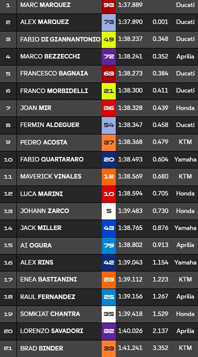 Le warm-up MotoGP du Grand Prix d'Argentine s'est achevé avec le meilleur temps de Marc Marquez pour un millième devant son frère Alex. Fabio di Giannantonio complète un top-3 100 % Ducati. Fabio Quartararo (10e) et Johann Zarco (13e) sont un peu plus loin. Et maintenant, place aux courses !