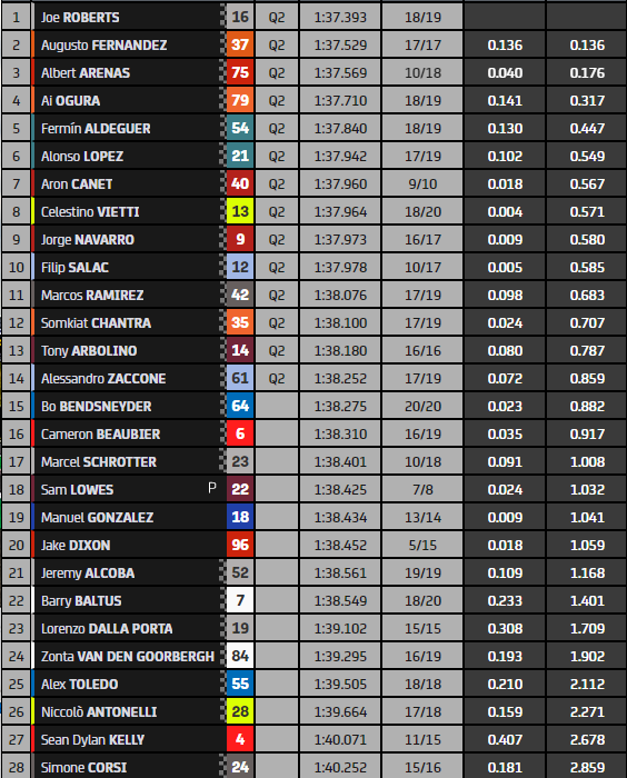 L’Américain Joe Robert a signé le chrono le plus rapide du jour. Le pilote Italtrans Racing Team devance son homologue de Red Bull KTM Ajo Augusto Fernandez et Albert Arenas. Malgré sa blessure au nez et plusieurs interventions du médecin, Aron Canet signe le septième temps, juste devant Celestino Vietti.
