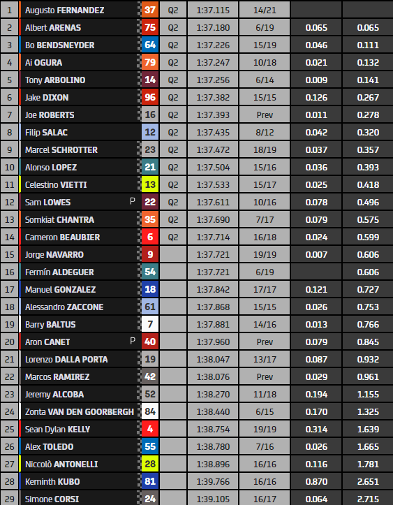 Le vainqueur du Grand Prix d’Allemagne, Augusto Fernandez, a établi le chrono le plus rapide en FP3, en 1’37″115. Le pilote Red Bull KTM Ajo devance Albert Arenas de 65 millièmes et le héros local Bo Bendsneyder de 0″111. Ai Ogura est bien placé en quatrième position. Le leader du championnat, Celestino Vietti, a fait le travail et sera qualifié directement en Q2. Les qualifications débuteront à 15h10.