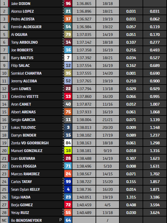 Jake Dixon s’est montré le plus rapide de la première séance d’essais du Grand Prix des Pays-Bas. Les deux SpeedUp d’Alonso Lopez et Fermín Aldeguer se sont placés juste derrière le Britannique. Le Belge Barry Baltus conclut la session au huitième rang.