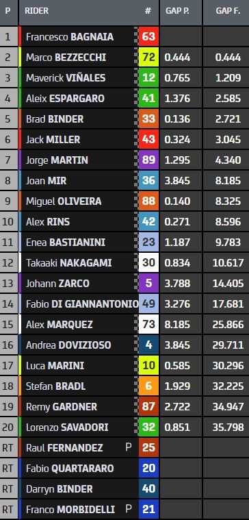 Championnat MotoGP après Assen (11/20) : 1. Fabio Quartararo 172 pts, 2. Aleix Espargaro 151 (-21), 3. Johann Zarco 114 (-58), 4. Francesco Bagnaia 106 (-66), 5. Enea Bastianini 105 (-67)… Classement complet à venir