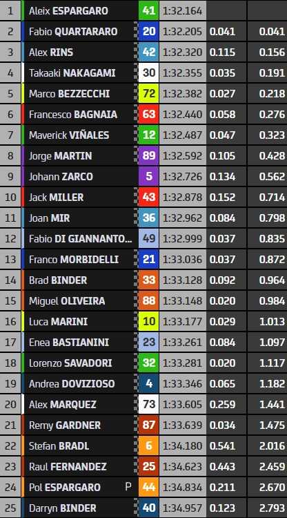 Les Ducatistes ne sont pas à la pointe du classement, mais sont quand même cinq directement qualifiés en Q2, avec Francesco Bagnaia (6e), Jorge Martin (8e), Johann Zarco (9e) et Jack Miller (10e) dans le top-10 en plus de Marco Bezzecchi (5e). Joan Mir (11e) le manque pour 84 millièmes et devra passer par le repêchage, où il retrouvera notamment les pilotes Gresini, Fabio di Giannantonio (12e) et Enea Bastianini (17e).