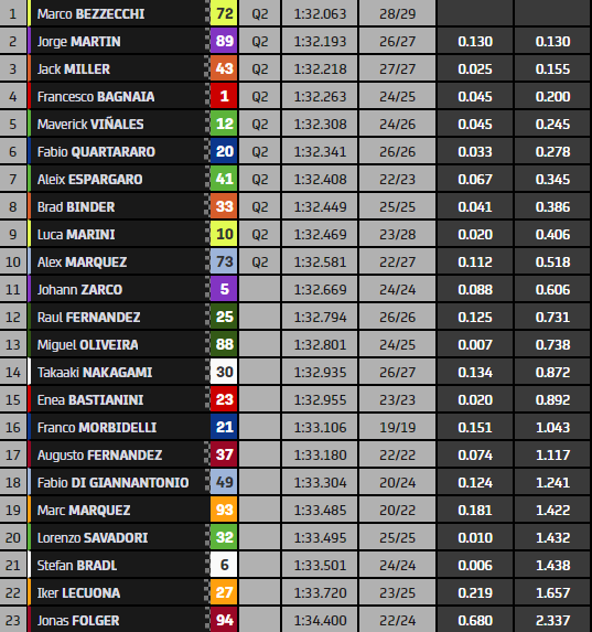 Le vendredi aura été la journée de Marco Bezzecchi ! Leader en P1, le pilote Mooney VR46 Racing Team a récidivé cet après-midi lors de la P2. Avec un chrono en 1’32.063, l’Italien a devancé Jorge Martin (+0.130) et Jack Miller (+0.155). Malmené ce matin, Francesco Bagnaia a réagi. Le champion du monde en titre a signé le quatrième temps (+0.200) pour se sauver et assurer sa place en Q2. Deux autres Ducati se sont aussi classées dans le top-10, celle de Luca Marini (9e, +0.406) et d’Alex Marquez (10e, +0.518).