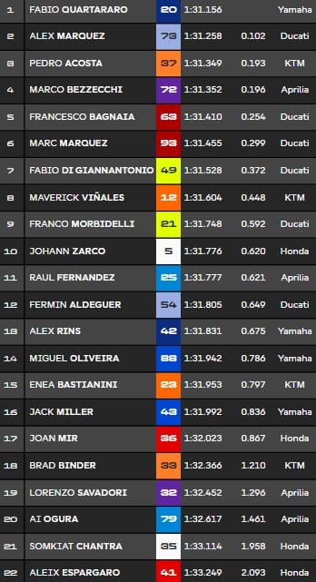 - Fabio Quartararo a signé le meilleur temps du jour en 1'31.156, devançant d'un dixième Alex Marquez. Avec Pedro Acosta 3e et Marco Bezzecchi 4e, quatre constructeurs sont aux quatre premières places. Le top-5 est complété par Francesco Bagnaia.