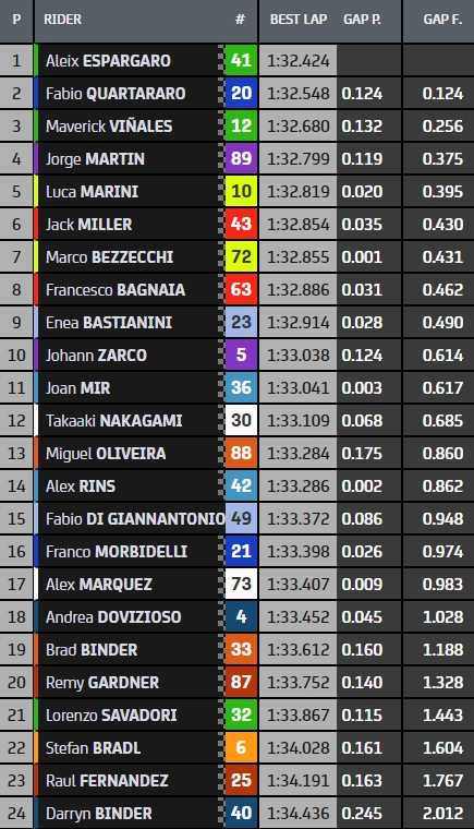 Aleix Espargaro a signé le meilleur temps du warm-up du Grand Prix des Pays-Bas, dernière séance avant la course de ce dimanche. Fabio Quartararo le suit d’un dixième, tandis que Maverick Viñales place une deuxième Aprilia dans le top-3. Suivent pas moins de sept pilotes Ducati de la quatrième à la dixième place, occupée par Johann Zarco.