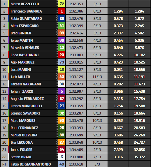 Jorge Martin a un temps pensé pouvoir jouer le podium. Le pilote Prima Pramac Racing finit 6e devant Maverick Viñales. Enea Bastianini et Alex Marquez prennent les derniers points mis en jeu. Luca Marini s’est classé 10e après avoir lui aussi été sanctionné pour non-respect des limites de piste.