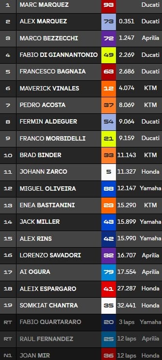 - Comme souvent le samedi, Francesco Bagnaia (5e) n'a rien pu faire et termine à 2,6 secondes du vainqueur. Maverick Viñales (6e) et Pedro Acosta (7e) prennent les points pour KTM. Il n'y en a pas pour Honda malgré les efforts de Johann Zarco (11e), alors que Joan Mir est tombé au premier tour.