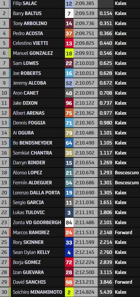 Championnat Moto2 actuel : 1. Tony Arbolino 41 pts, 2. Aron Canet 33 (-8), 3. Pedro Acosta 29 (-12), 4 Jake Dixon 26 (-15), 5. Filip Salac 22 (-19)… Classement complet ici