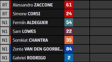 Celestino Vietti reste en tête du classement général malgré sa chute. Ai Ogura et Tony Arbolino prennent les médailles d’argent et de bronze provisoires, à 14 et 16 points du pilote de l’équipe VR46.