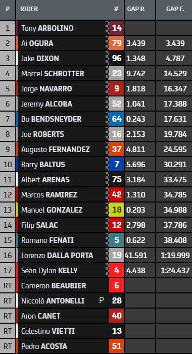 Tant d’incidents qui, de fil en aiguille, ont offert sur un plateau la première place à Tony Arbolino. Le pilote italien, qui entame sa deuxième saison en Moto2, n’en demandait pas tant. Porté en tête peu avant la mi-course, il n’a pas tremblé à l’approche de sa première victoire dans la catégorie. Et en a même remis une couche, augmentant son avance sur ses poursuivants, Jake Dixon d’abord, Ai Ogura ensuite après que le Japonais soit passé devant le Britannique. Tony Arbolino signe sa première victoire en Moto2 devant Ai Ogura, qui confirme devenir un cador de la catégorie intermédiaire. Troisième, Jake Dixon monte sur le premier podium de sa carrière pour sa 51e course.