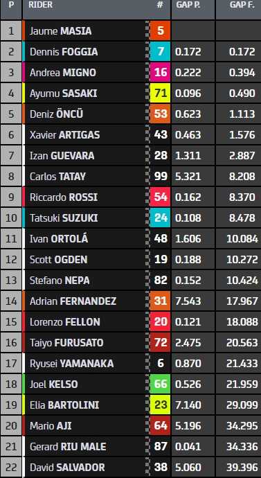 Championnat Moto3 après le GP d’Argentine (3/21) : 1. Dennis Foggia 74 pts, 2. Sergio Garcia 58 (-16), 3. Andrea Migno 41 (-33), 4. Izan Guevara 37 (-37), 5. Deniz Öncü 37 (-37)…