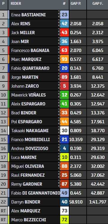 En difficulté en deuxième partie de course, les pilotes Pramac Jorge Martin (8e) et Johann Zarco (9e) ont rétrogradé et terminent finalement moins bien qu’espéré. Maverick Viñales (10e) ferme la marche du top-10 après avoir remporté le combat des Aprilia face à Aleix Espargaro (11e).