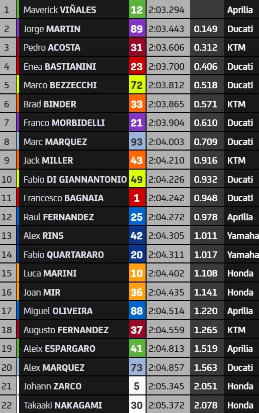 Descendu en 2'03.294, déjà à 1,4 seconde du record absolu d'Austin, Viñales devance la Ducati de Jorge Martin (+0.149) et la KTM de Pedro Acosta (+0.312), impressionnant troisième pour sa première fois en MotoGP sur ce tracé si atypique. Le trio hispanique est suivi d'un duo italien avec Enea Bastianini, vainqueur ici en 2022 et quatrième temps (+0.406), devant Marco Bezzecchi (+0.518) toujours en quête de son premier podium de l'année.