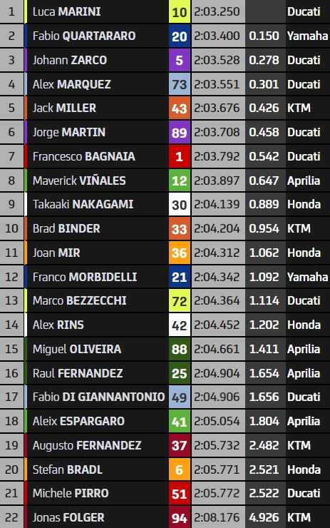 Maverick Vinales (huitième) permet à Aprilia d’être présent dans le top-10, de même que Takaaki Nakagami pour Honda derrière lui. Le Japonais a étonnamment dominé les RC213V de Joan Mir (onzième) et Alex Rins (quatorzième), pourtant meilleurs durant la quasi-totalité de la séance. Dixième et dernier pilote provisoirement qualifié, Brad Binder insère une deuxième KTM aux avant-postes.