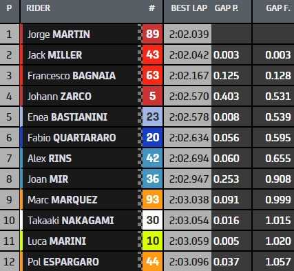 Premier à faire tomber le précédent record du circuit, le 2’02.135 de Marc Marquez qui datait de 2015, Jack Miller pensait avoir fait le plus dur pour enlever la pole. Mais Jorge Martin la lui a finalement arrachée des mains pour 3 millièmes. Trois petits millièmes qui font du Martinator la star du jour. L’autre star, c’est la Ducati Desmosedici.