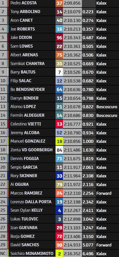 Le job est pour l’instant fait pour le leader du championnat, Tony Arbolino (2e), de même que pour ses adversaires pour le titre, Pedro Acosta (1er) et Aron Canet (3e). L’Américain Joe Roberts est dans le coup (4e), comme les Britanniques Jake Dixon (5e) et Sam Lowes (6e). Le Belge Barry Baltus s’est montré aux avant-postes (9e) et met derrière lui du beau monde. Notamment les pilotes Boscoscuro Alonso Lopez (13e) et Fermin Aldeguer (14e) qui vont devoir surveiller leurs arrières, car ils sont à la limite du top-14.