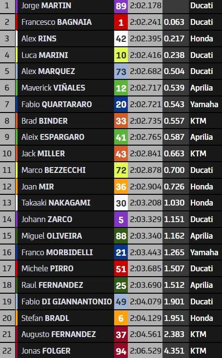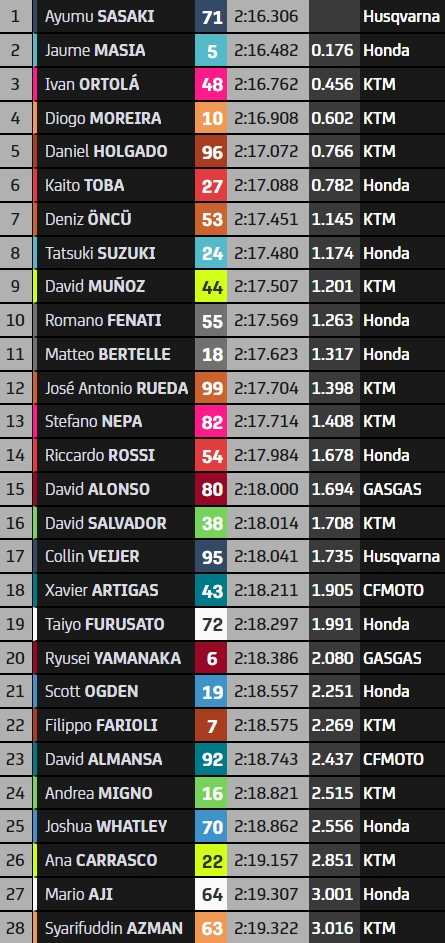 Les cadors sont dans le coup, qu’il s’agisse du leader du championnat Daniel Holgado (5e), de son dauphin Diogo Moreira (4e) ou d’hommes comme Deniz Öncü (7e) et Tatsuki Suzuki (8e). Il faudra de bonnes conditions de roulage pour descendre sous les 2’16 et battre la référence d’Ayumu Sasaki (1er) en 2’16.306.