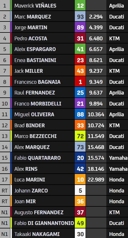 Au classement général, Martin étend son avance sur Bastianini, son nouveau dauphin à 24 points. Brad Binder, seulement 12e ce samedi, se retrouve à 25 unités. Bagnaia est à 28, tandis que Marquez rejoint le top-5 du championnat à 31 points du leader.