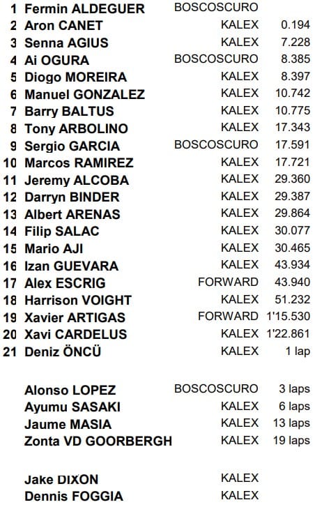 Arrivé quatrième, Ai Ogura sauve de précieux points dans la course au titre. Le Japonais mène le championnat avec 65 longueurs d'avance sur Canet (2e), 66 sur Aldeguer (3e) et Sergio Garcia (4e). Il en reste 75 à prendre.
