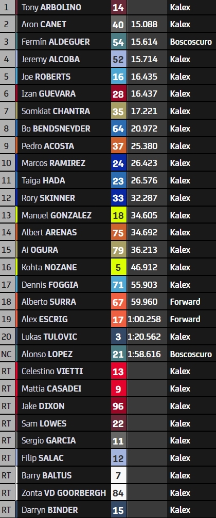 Le quart d’heure passé en piste a vu une douzaine de concurrents partir à la faute, avec parmi eux Sergio Garcia qui menait, Alonso Lopez, Sam Lowes, Celestino Vietti, Jake Dixon, Filip Salac, Ai Ogura ou encore le Belge Barry Baltus. Le leader du championnat, Pedro Acosta, est tombé dans le tour de mise en grille et a dû s’élancer dernier. Il est remonté jusqu’au neuvième rang.