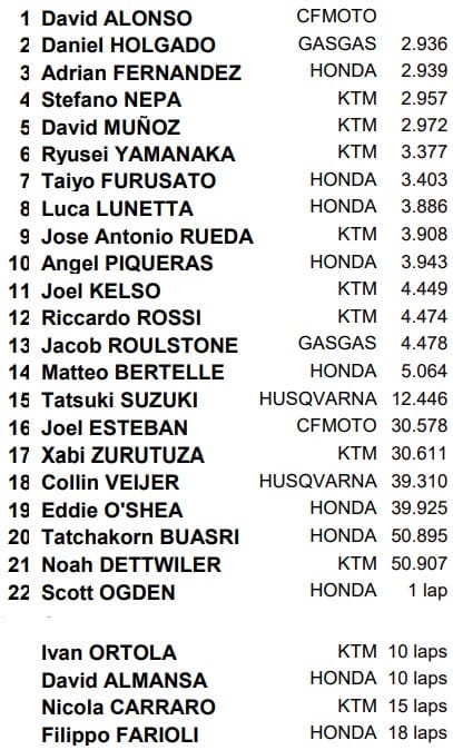 Championnat Moto3 : 1. David Alonso 346, 2. Daniel Holgado 232 (-114), 3. Collin Veijer 209 (-137), 4. Ivan Ortola 191 (-155), 5. Adrian Fernandez 153 (-193)...