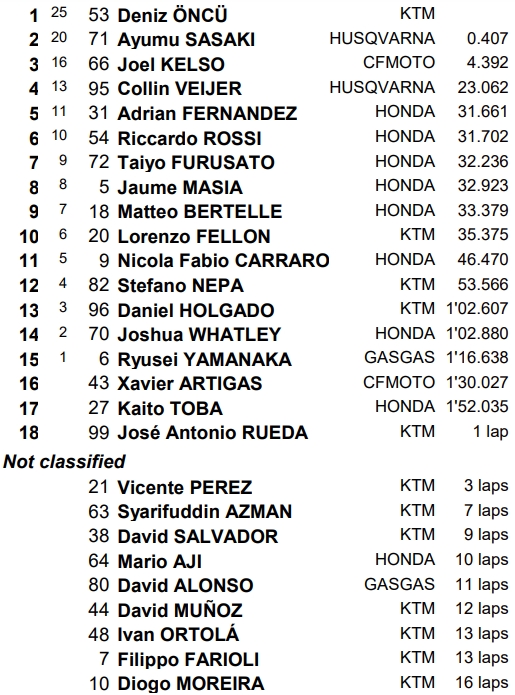 Championnat Moto3 : 1. Masia 217 pts, 2. Sasaki 213 (-4), 3. Holgado 195 (-22), 4. Alonso 180 (-37), 5. Öncü 180 (-37)…