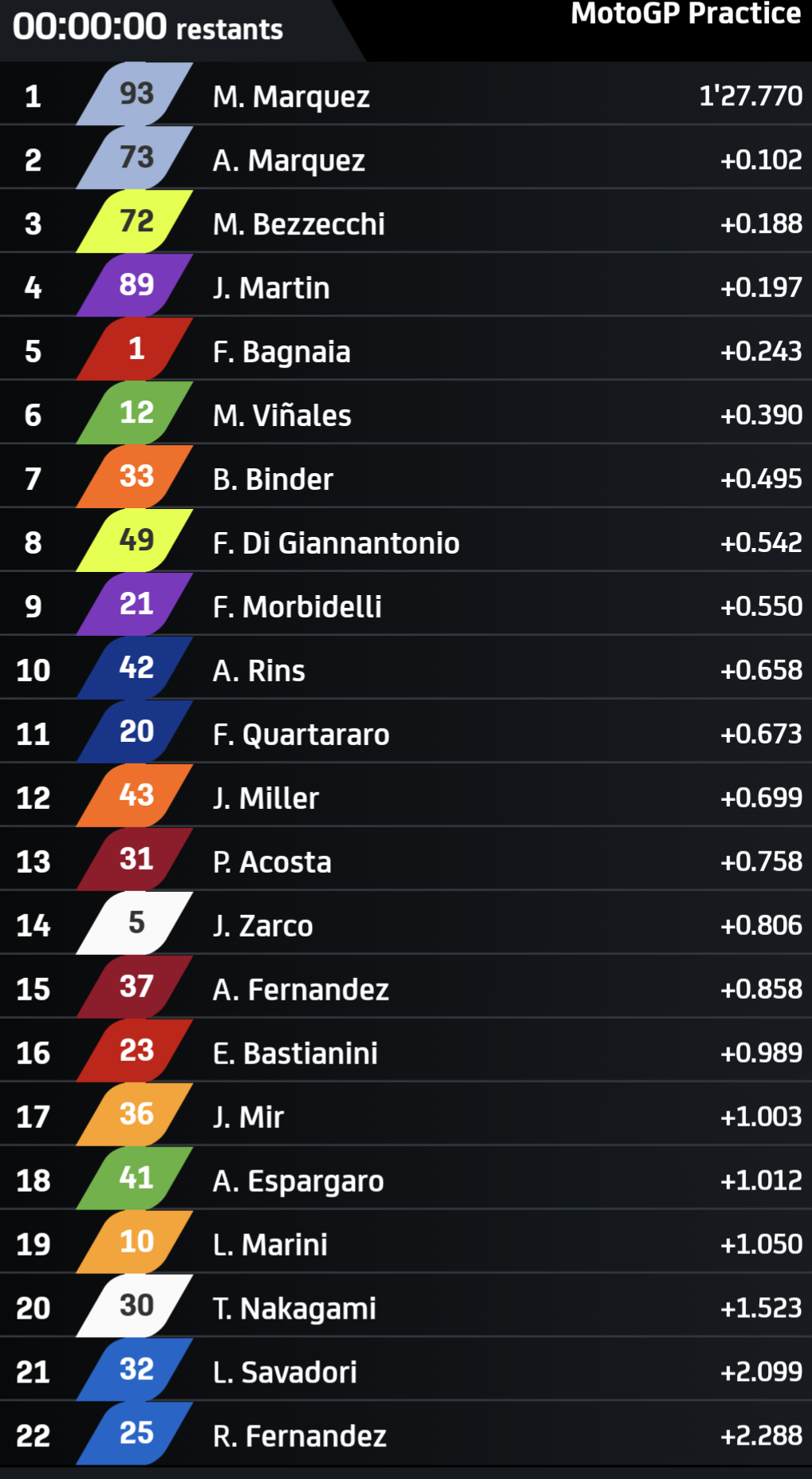 Marc Marquez a signé le meilleur temps de la séance d'essais MotoGP à Phillip Island, dans une session marquée par plusieurs chutes (Pedro Acosta, Jack Miller, Lorenzo Savadori...). Il termine devant son frère Alex, et dans un top-5 100 % Ducati où figurent les deux candidats au titre, Jorge Martin (4e) et Francesco Bagnaia (5e).