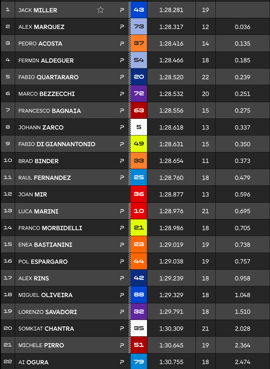 Johann Zarco s'est quant à lui hissé en huitième position à trois dixièmes de Miller devant Fabio Di Giannantonio et Brad Binder.