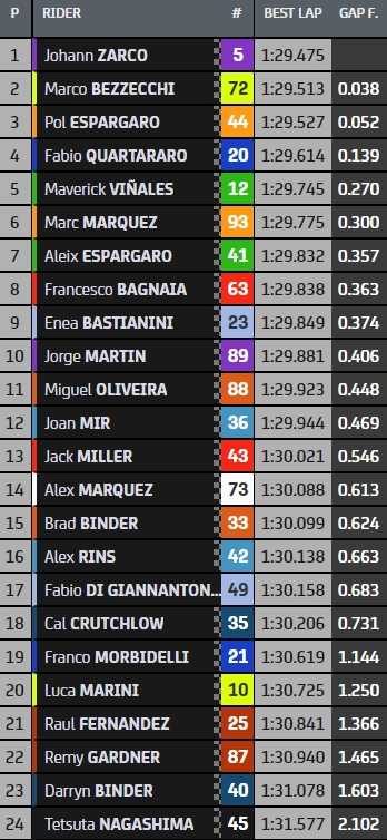 Fabio Quartararo n’y était pas en FP1, mais le Français a rassuré en fonçant à travers les rafales de vent australiennes pour remonter au classement (4ème, +0.139). Son ancien coéquipier Maverick Viñales complète le top-5 (5ème, +0.270), tandis que la deuxième Aprilia d’Aleix Espargaro fait le job (7ème, +0.357). Le dauphin du Niçois, Francesco Bagnaia, est aussi dans le bon groupe (8ème, +0.363). Tout comme Enea Bastianini qui parvient à se hisser dans le top-10 (9ème, +0.374).