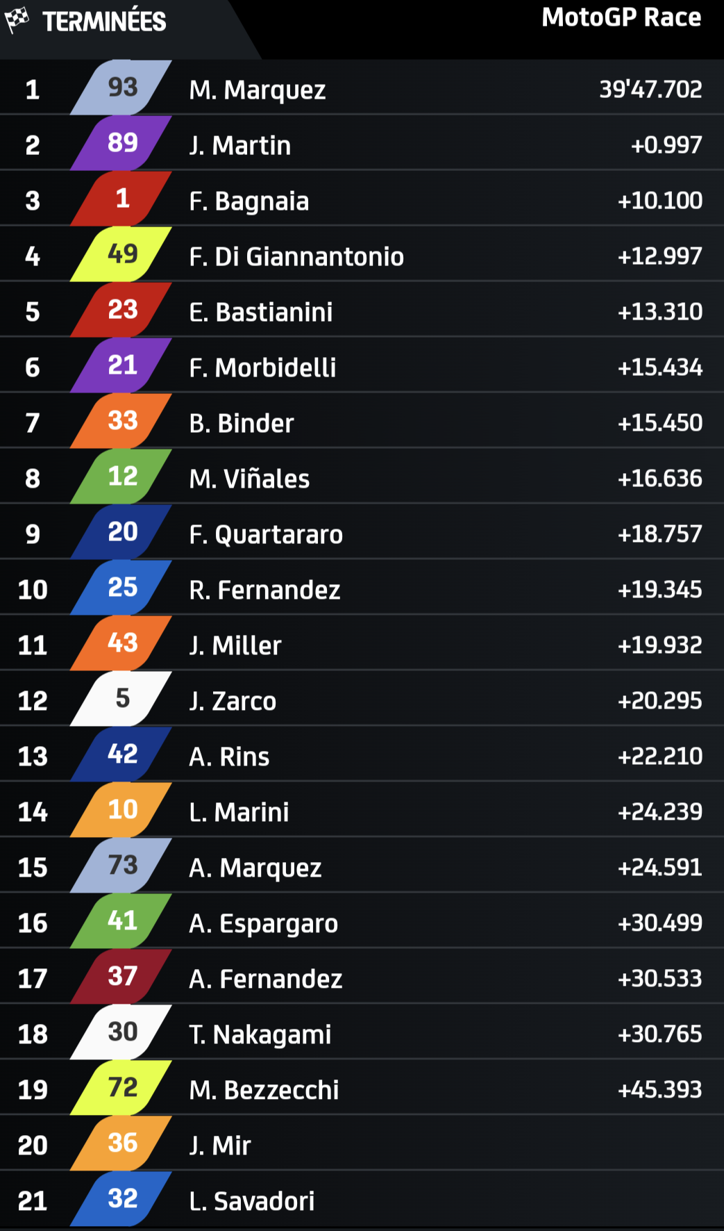 Patient derrière Martin, Marquez a attendu le 24e tour pour porter l'estocade. Le n°89 a répliqué, le n°93 est repassé une boucle plus tard, à nouveau au virage 4. Le mouvement décisif pour remporter son troisième Grand Prix de l'année après ceux d'Aragon et de Saint-Marin. Vaincu, Martin a aussi de quoi célébrer : il prend 4 points à son rival pour le titre Bagnaia, troisième à une dizaine de secondes des leaders.