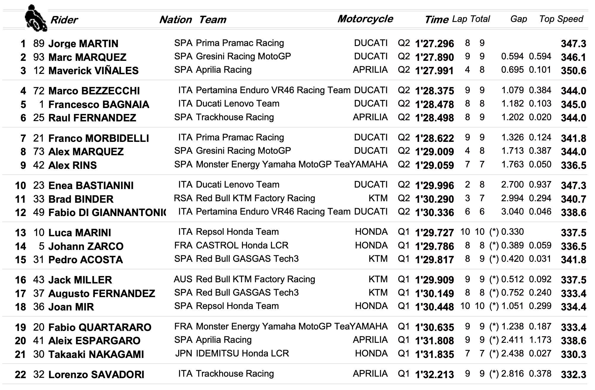 Jorge Martin s’est montré le plus rapide des qualifications devant Marc Marquez et Maverick Viñales. Francesco Bagnaia partira de la cinquième place.