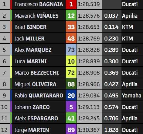 À domicile, KTM manque de peu la pole mais se classe dans le haut du tableau avec Brad Binder troisième (+0.114), suivi de près par Jack Miller quatrième (+0.230). Les machines oranges auront les deux motos italiennes en ligne de mire au premier virage à 15h, heure du départ de la course sprint. Elles devront aussi se méfier des Ducati d’Alex Marquez (5e, +0.289), Luca Marini (6e, +0.300) et Marco Bezzecchi (+0.369). Ce-dernier a de quoi être déçu car il a roulé plus vite vendredi, établissant un record du circuit qui n’a pas été battu ce samedi.