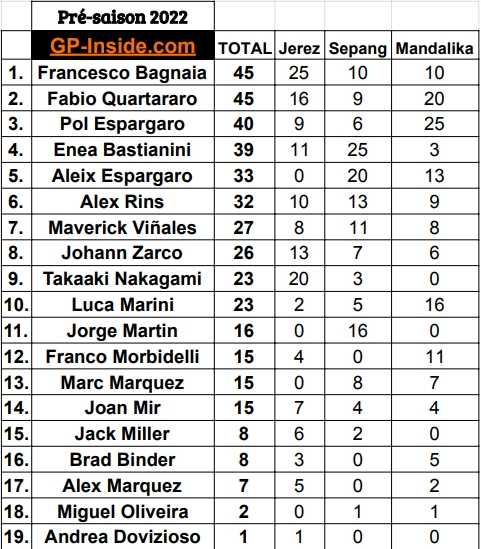 Prendre les résultats hivernaux des pilotes dans leur ensemble reste cependant intéressant. Cela donne une certaine couleur au peloton, et permet de dresser quelques enseignements tant qu’on en évite la sur-interprétation, tout en ayant en tête le cas par cas de chacun. Les résultats de la pré-saison 2022 en sont la preuve. GP-Inside a repris ceux des tests de Jerez, Sepang puis Mandalika, puis calculé le tout comme s’ils rapportaient les mêmes points qu’en course. En voici le verdict.